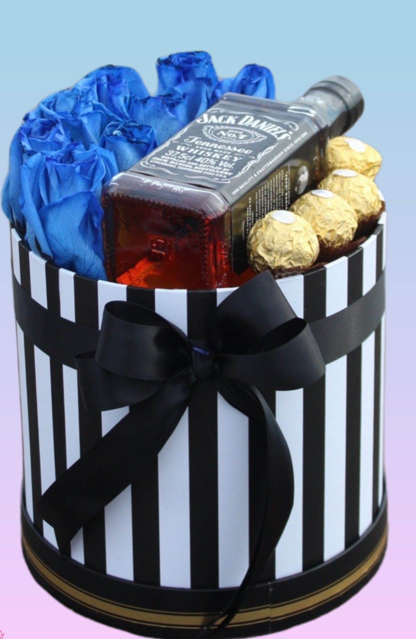 box día de san valentina con caja personalizada, botella de Pisco, Bombones Ferrero Rocher 100grs y flores