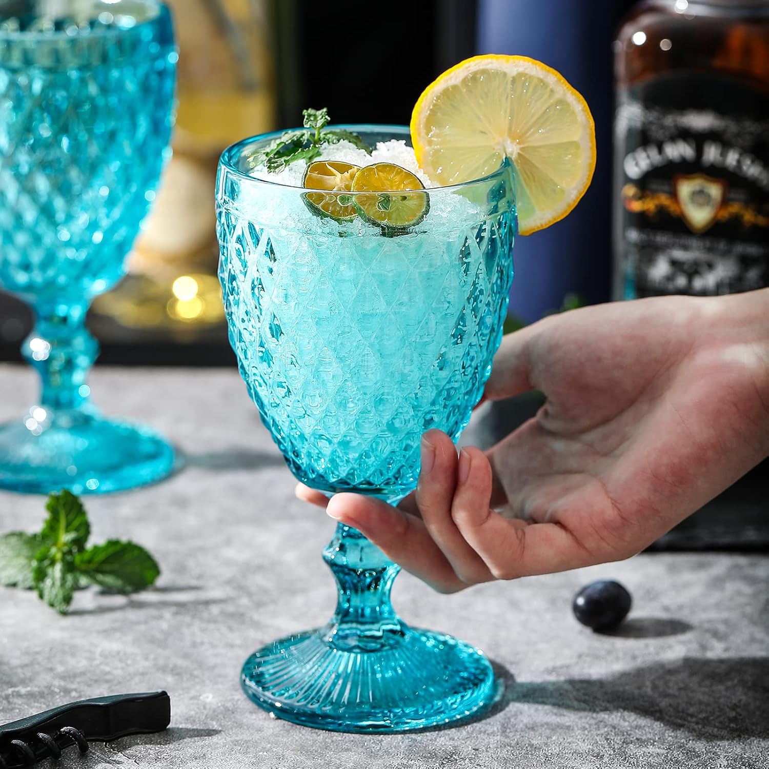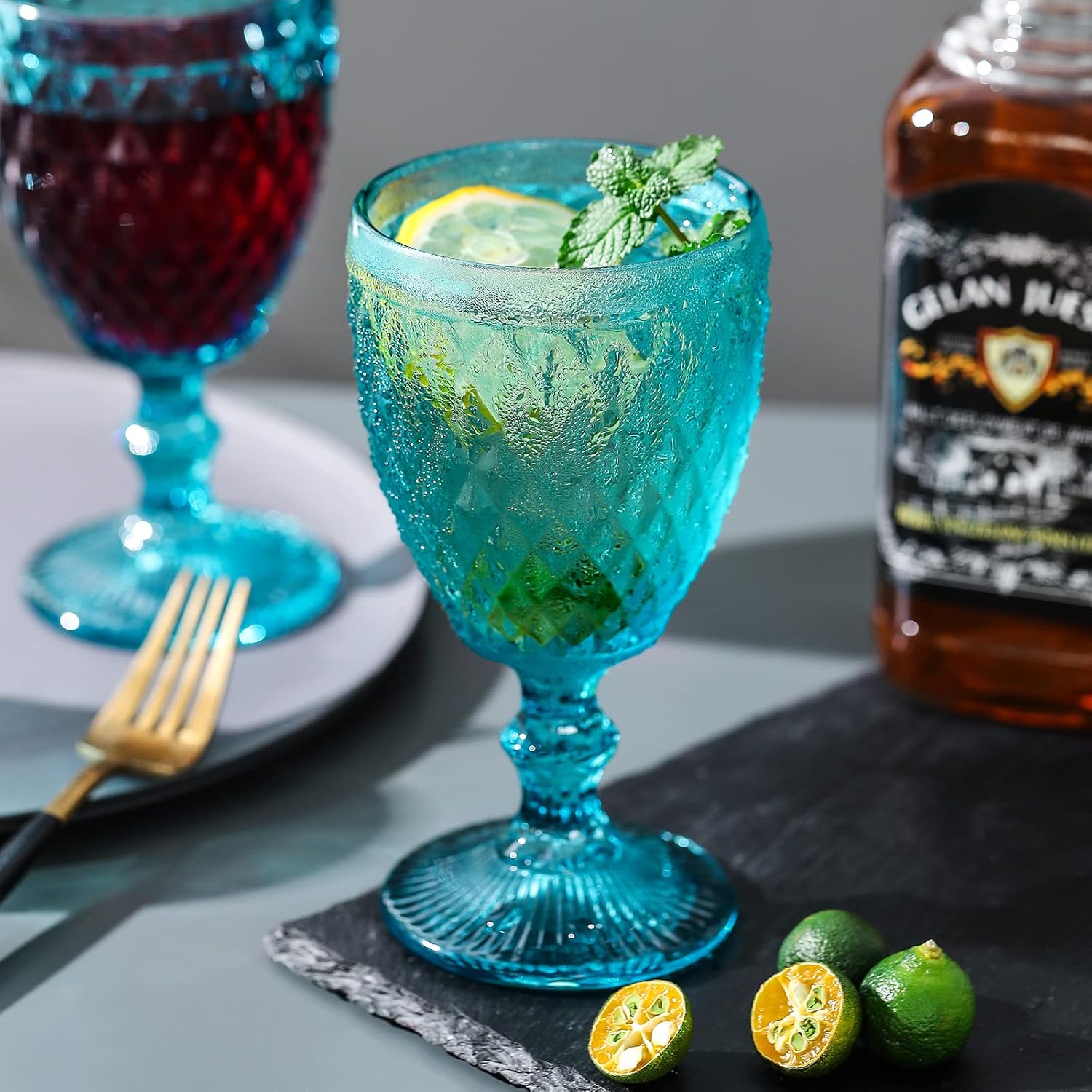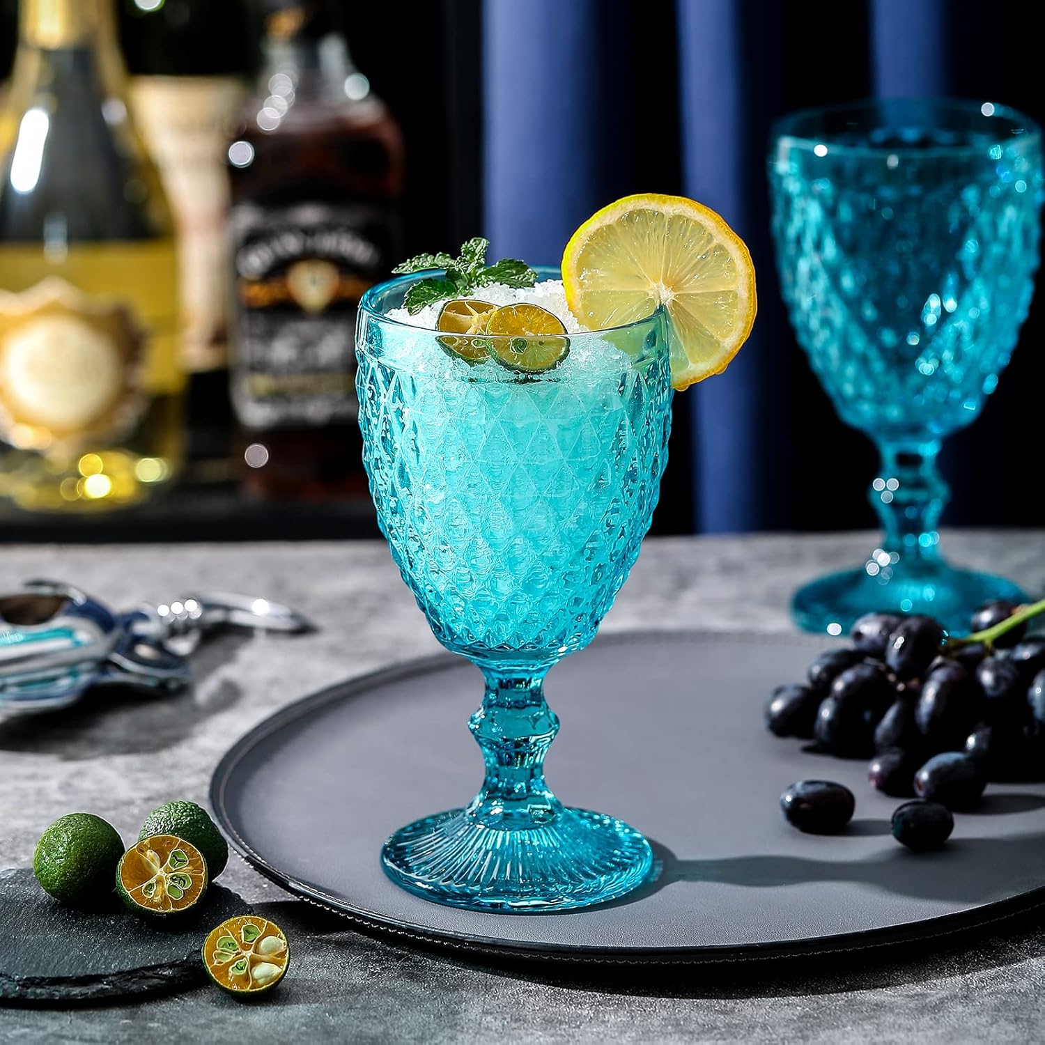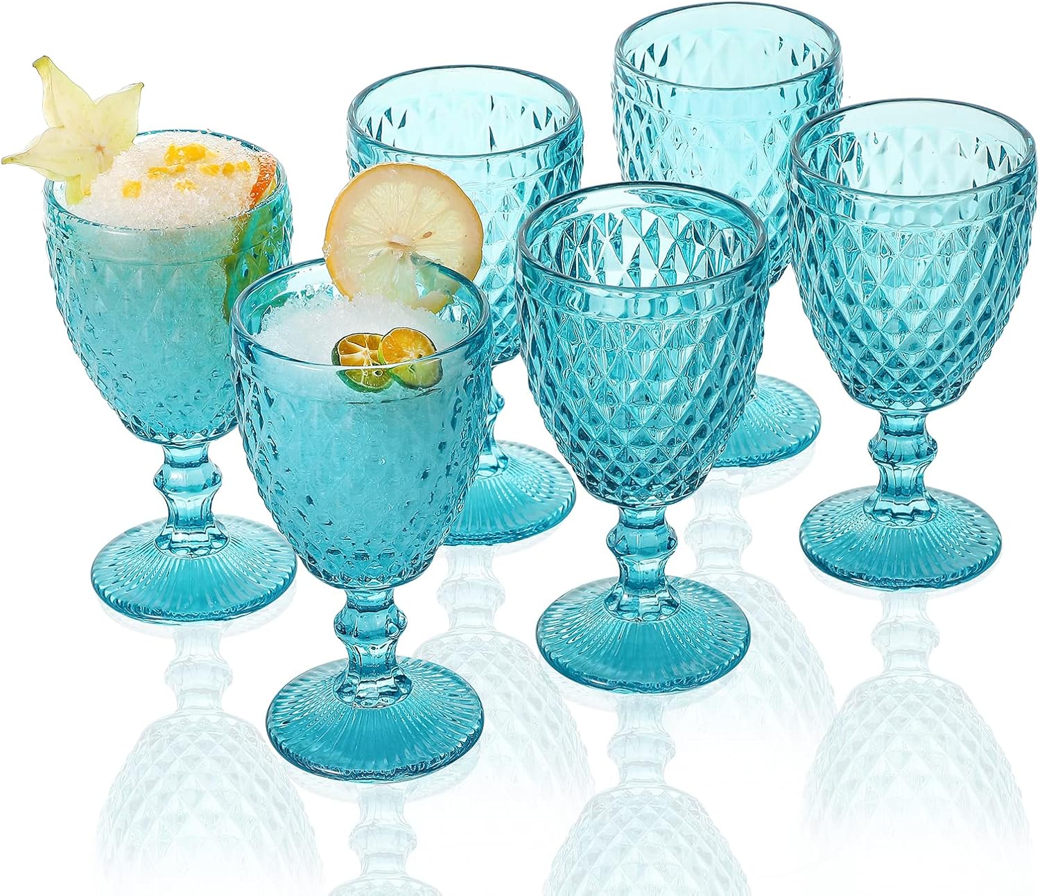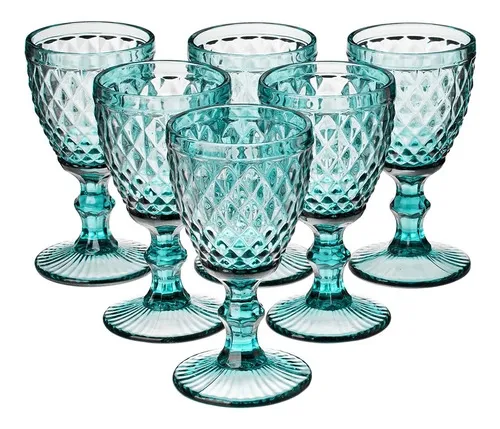 Set con 6 copas de colores celeste talladas, ideal para todo tipo de eventos, como bodas, comuniones, bautizos, cumpleaños y hogar. El color forma parte del material por lo que no desaparece con los lavados.